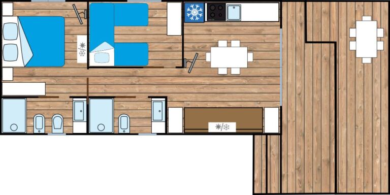 Le nuove mobile homes KIKI BEACH misurano 40 mq e possono ospitare fino a sei persone. Si compongono di camera matrimoniale, seconda camera con due singoli e terzo letto rialzato, zona cottura con piano a induzione e frigorifero completo di freezer, area living con divano letto, due bagni completi di box doccia di cui uno con bidet. In dotazione due televisori da 32″ e 39″, lavastoviglie, forno a microonde e bollitore elettrico.